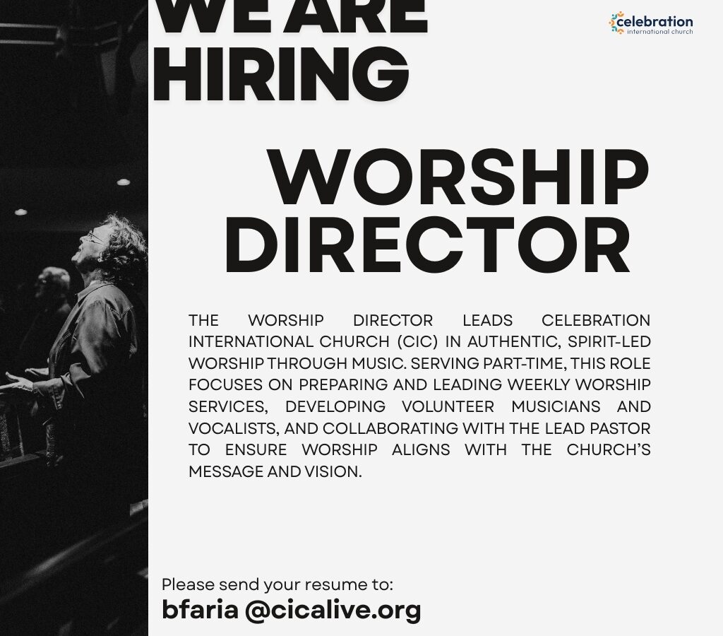 The Worship Director leads Celebration International Church (CIC) in authentic, Spirit-led worship