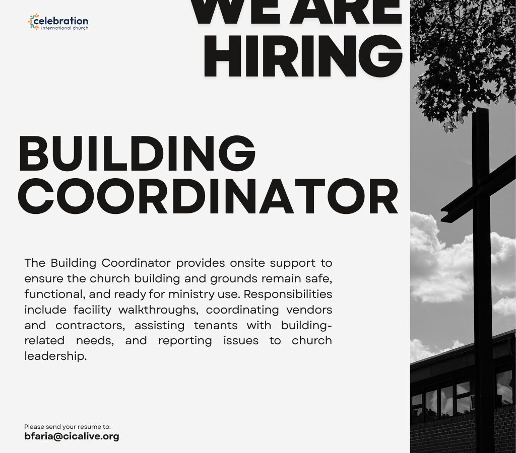 The Building Coordinator provides onsite support to ensure the church building and grounds remain safe, functional, and ready for ministry use. Responsibilities include facility walkthroughs, coordinating vendors and contractors, assisting tenants with building-related needs, and reporting issues to church leadership.